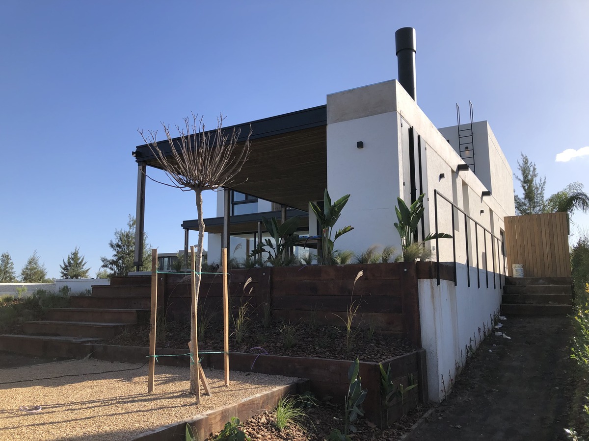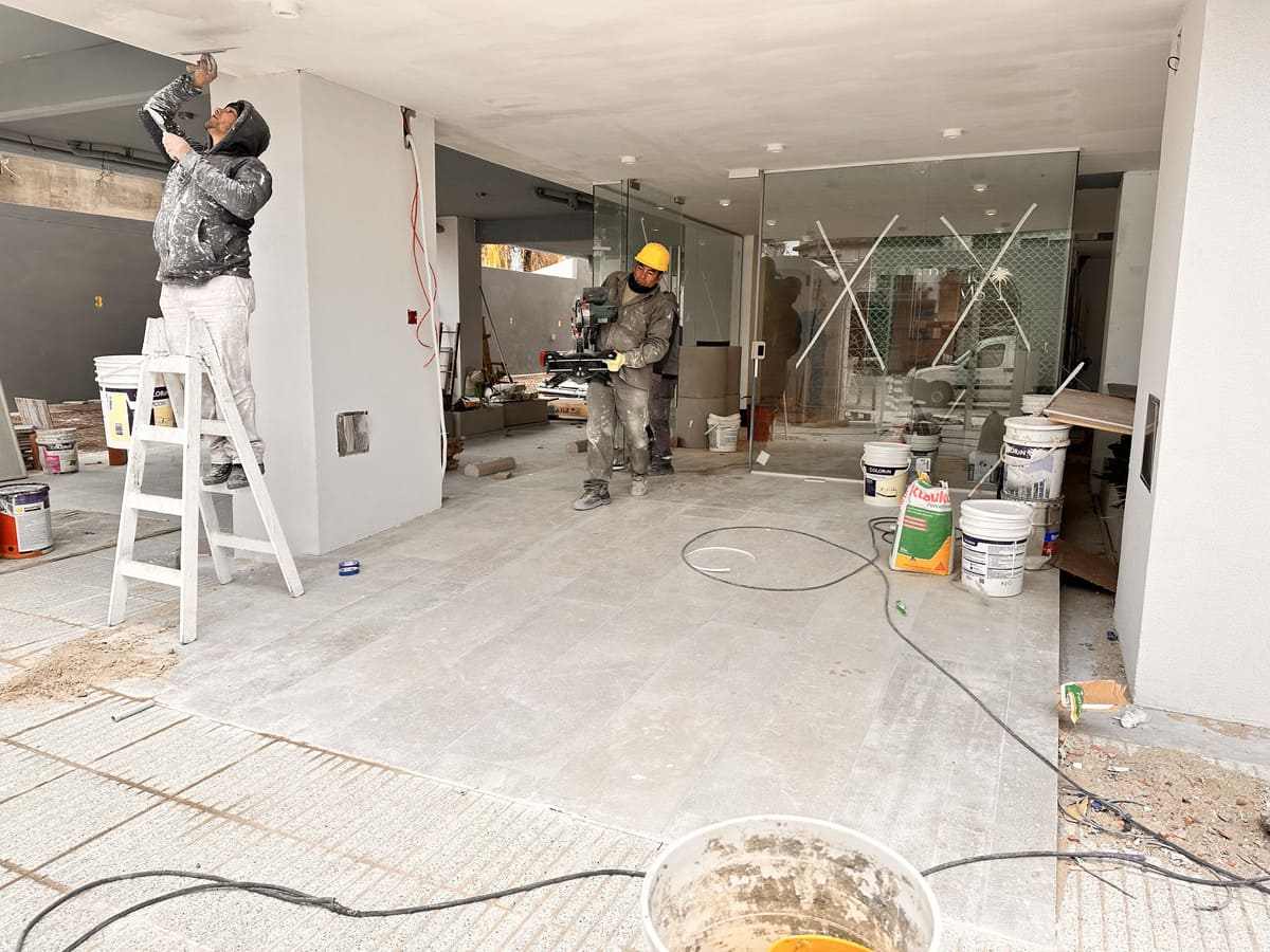 La obra inició con una platea en fundaciones acompañado con estructura de hormigón visto de vigas, columnas y losa en entrada vehicular y galería, con tabiques en sector de la parrilla continuando con la obra realizamos toda la mampostería y las terminaciones interiores y exteriores. En las terminaciones interiores se realizó colocación de porcelanato en todo los pisos y pintura blanca satinada en todas las paredes y techos. En las terminaciones exteriores se realizó revoque proyectable acompañado con revestimiento texturado tarquini color natural por otro lado en las entradas vehicular y peatonal se hizo un acabado de hormigón alisado con marmolina.
